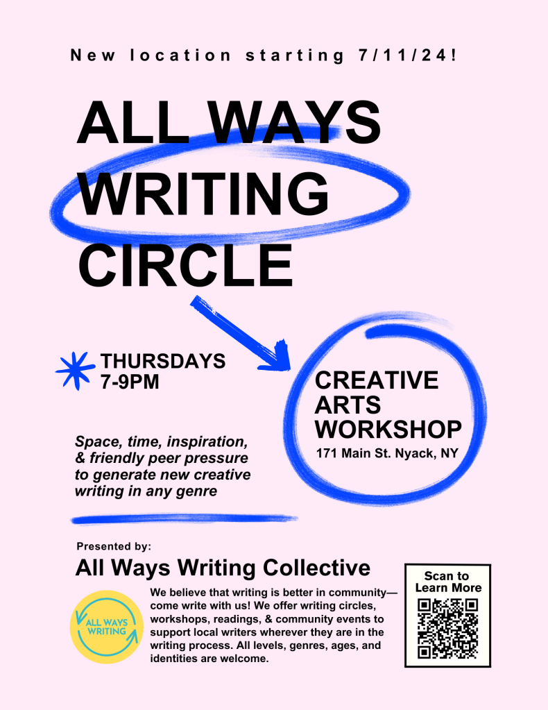 - Where and when are the writing circles? Writing circles take place Thursday nights from 7 to 9pm at Creative Arts Workshop, located at 171 Main Street Nyack, NY.